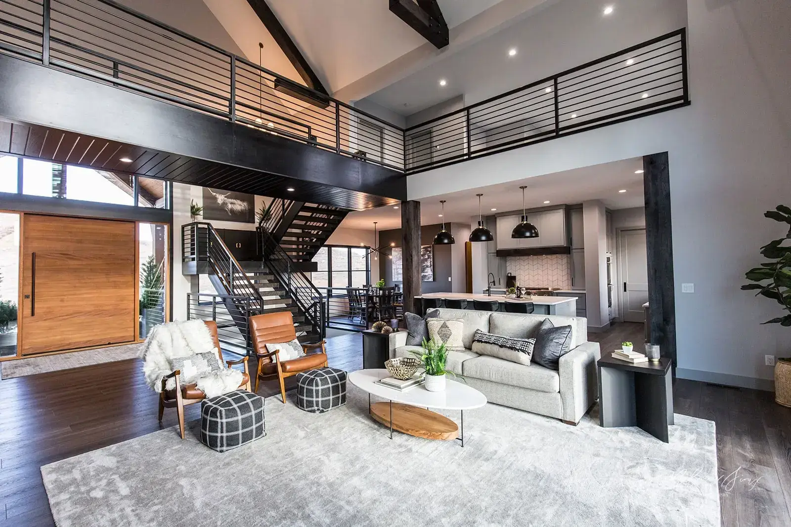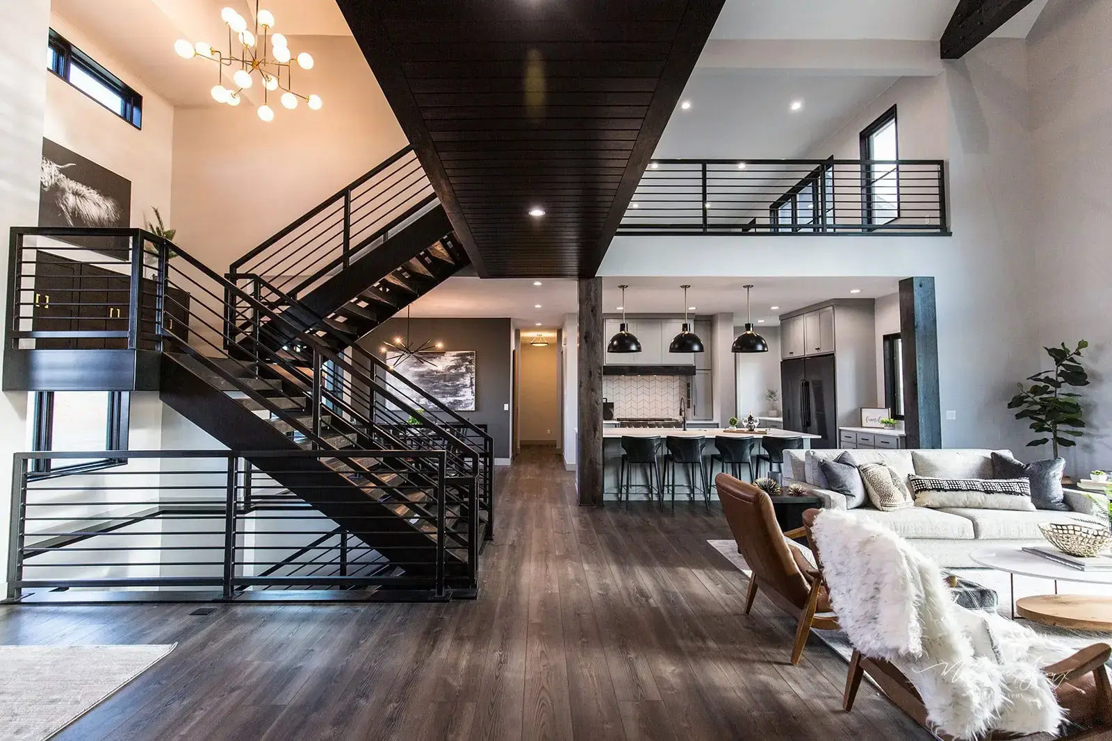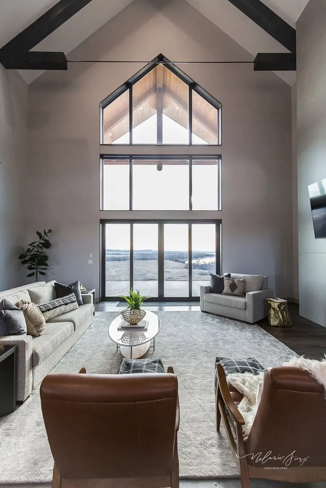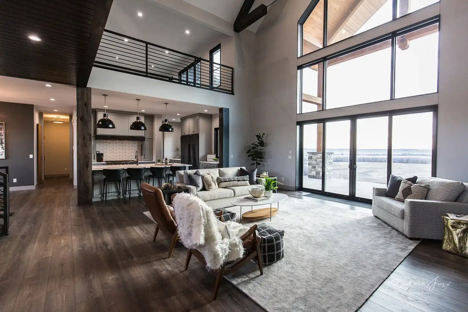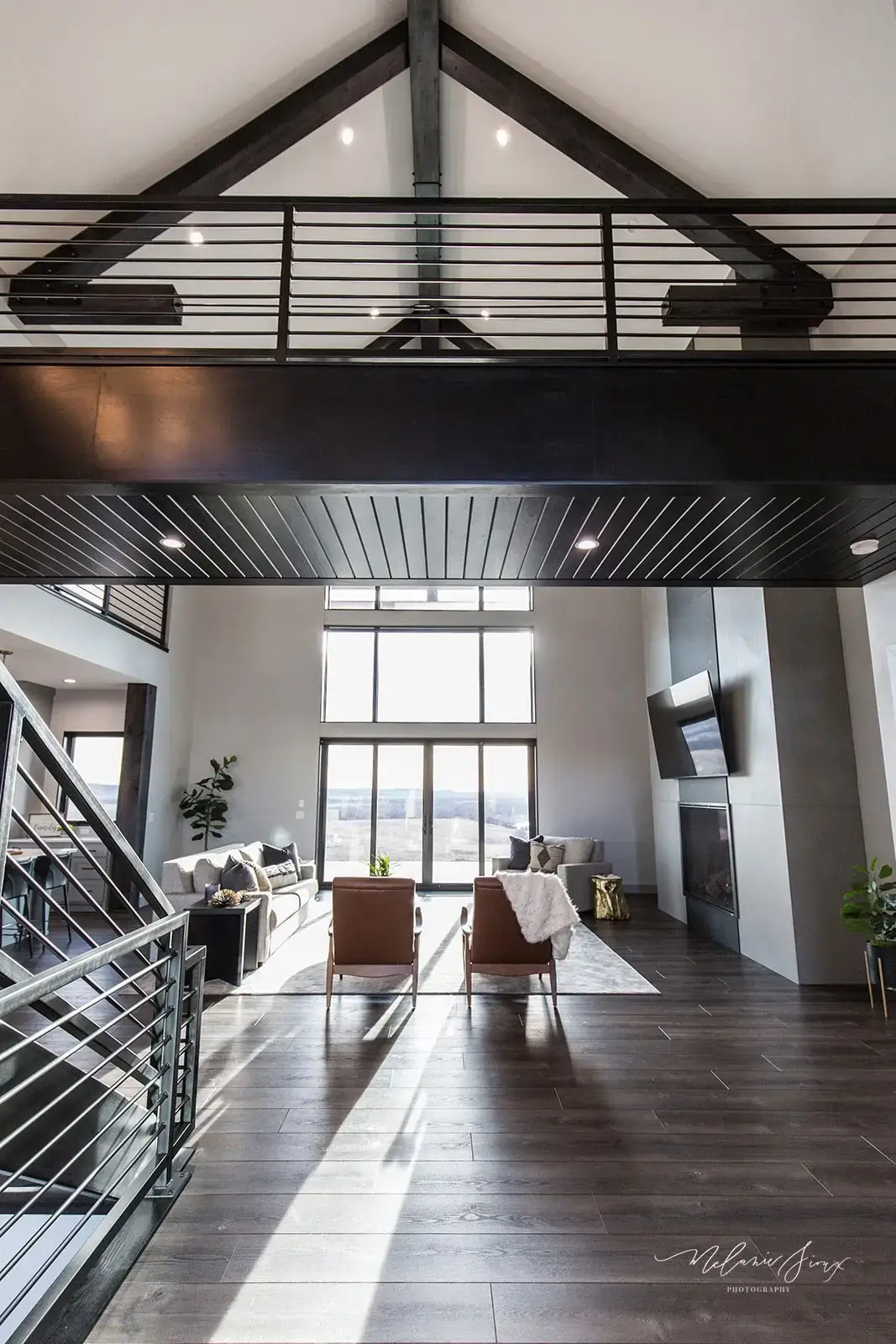 This home setting is rural overlooking the Missouri River. Industrial Design is rooted in raw materials, and exposed structures. This style is all about celebrating materials rather than disguising them. The core characteristics are exposed: concrete, steel, blackened metal, and wood. Nothing is overly polished. Natural moody palette includes colors of charcoal, warm gray, cognac leather, aged brass and matte black. Industrial leans a bit masculine, but layering warm woods and textiles softens the look. Open airy high ceilings, large black steel-framed windows and minimal walls let the structure become the decor. Statement lighting with oversized metal shades and sculptural-styled sconces. Industrial Modern lends to a cleaner sleeker design.
