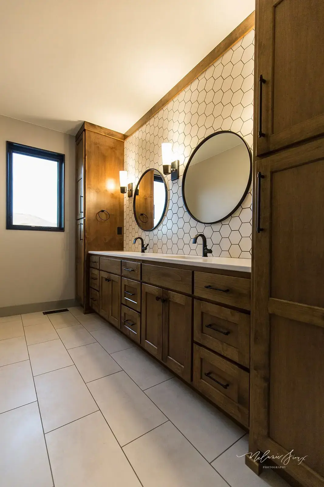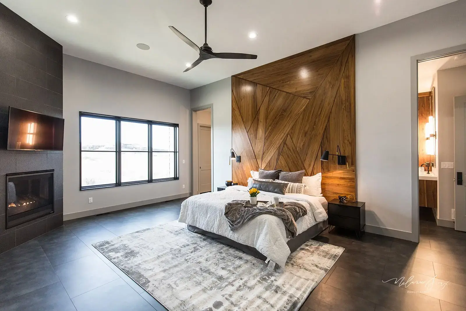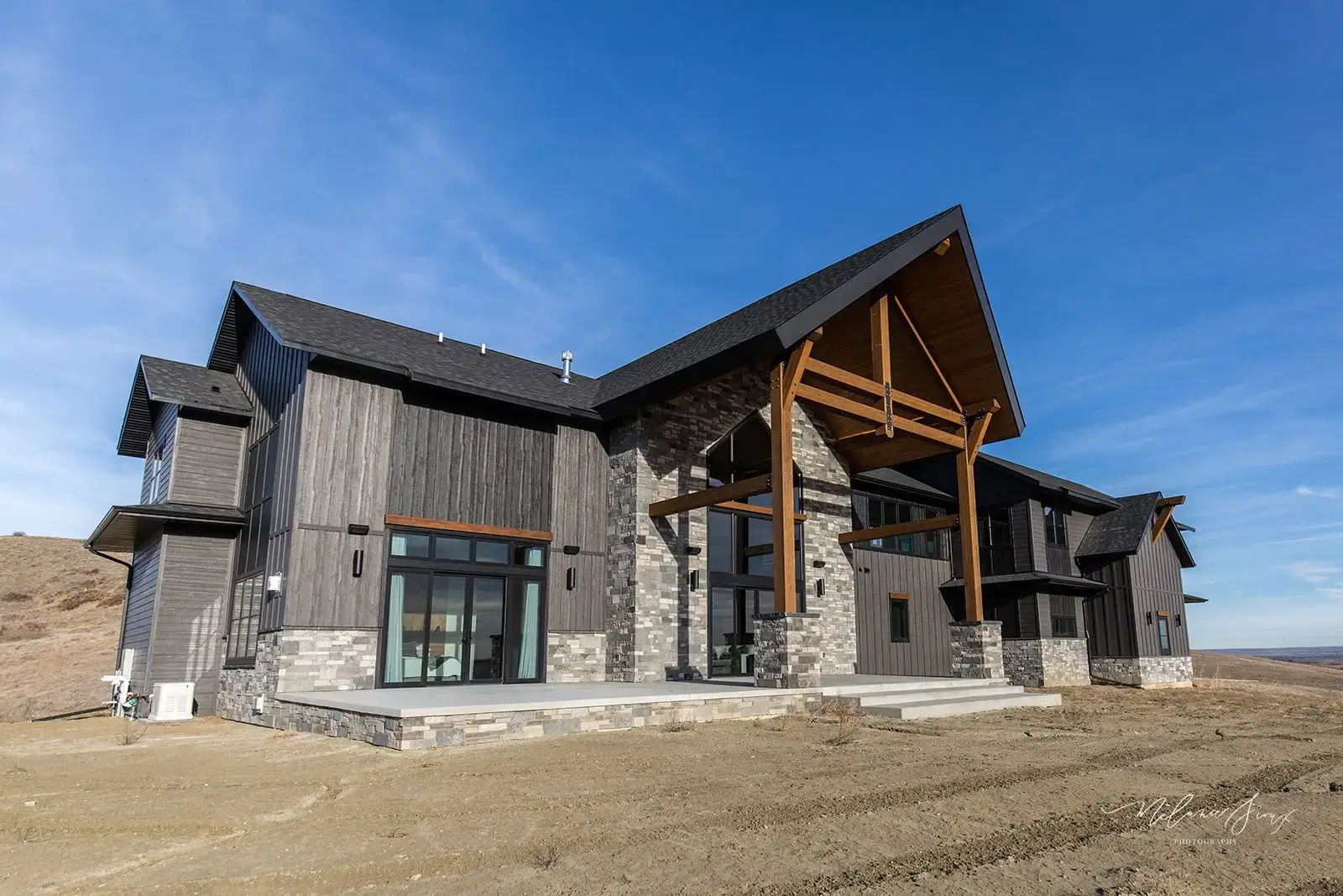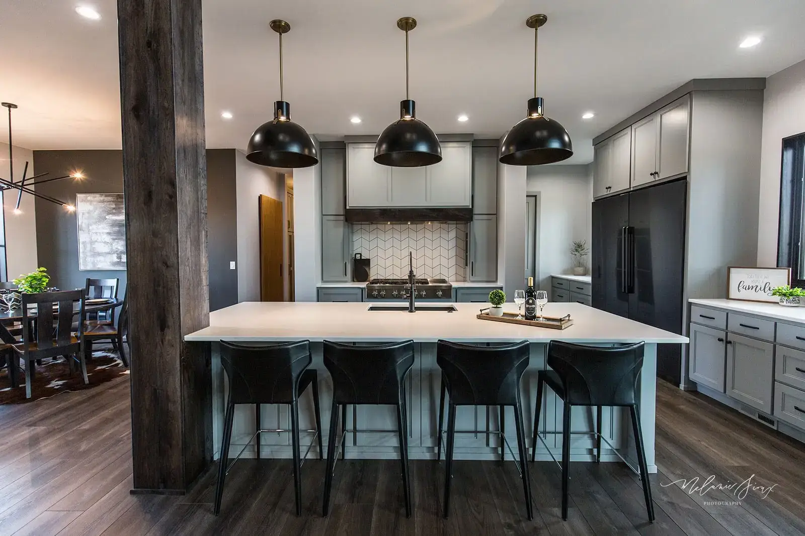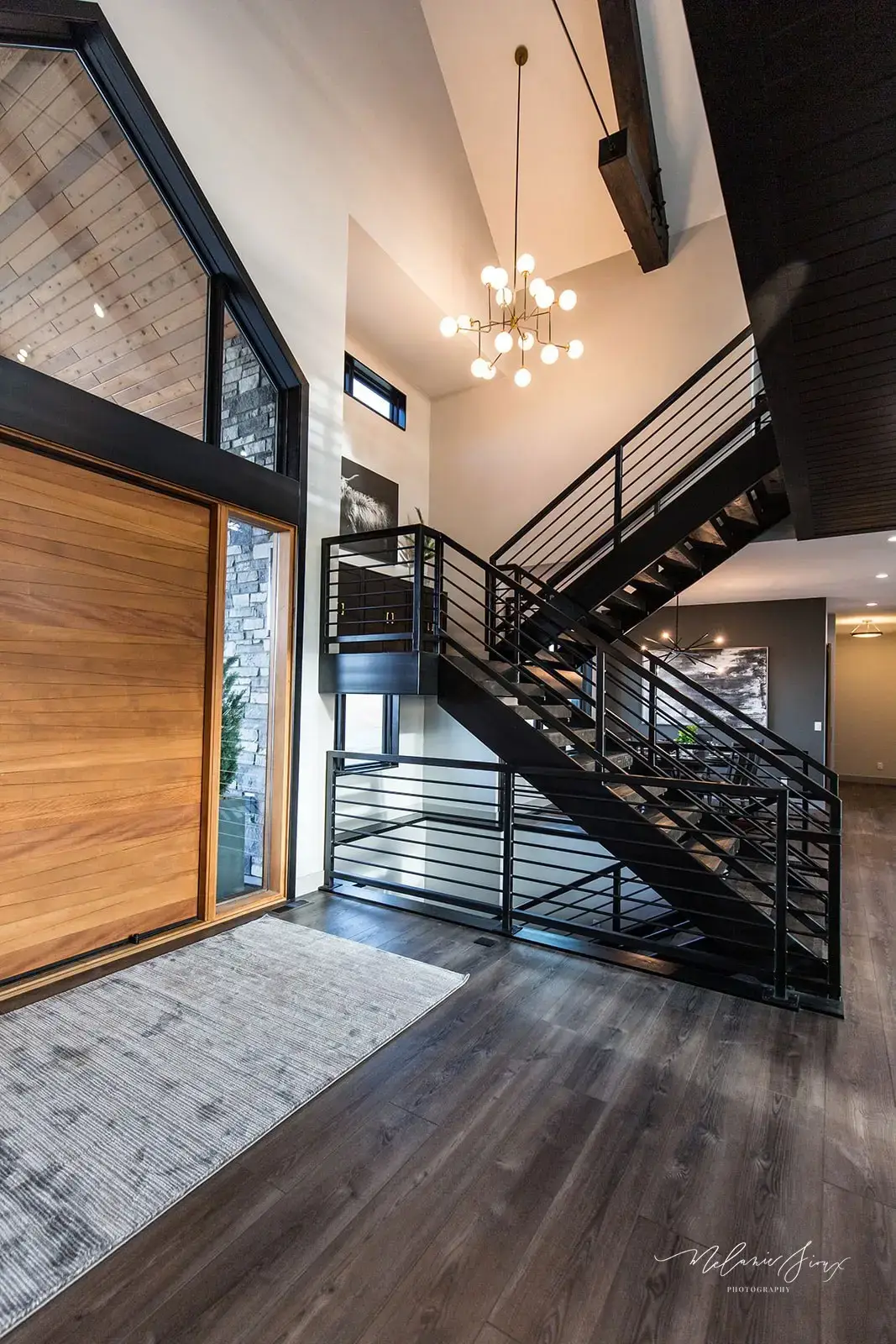 This home setting is rural overlooking the Missouri River. Industrial Design is rooted in raw materials, and exposed structures. This style is all about celebrating materials rather than disguising them. The core characteristics are exposed: concrete, steel, blackened metal, and wood. Nothing is overly polished. Natural moody palette includes colors of charcoal, warm gray, cognac leather, aged brass and matte black. Industrial leans a bit masculine, but layering warm woods and textiles softens the look. Open airy high ceilings, large black steel-framed windows and minimal walls let the structure become the decor. Statement lighting with oversized metal shades and sculptural-styled sconces. Industrial Modern lends to a cleaner sleeker design.